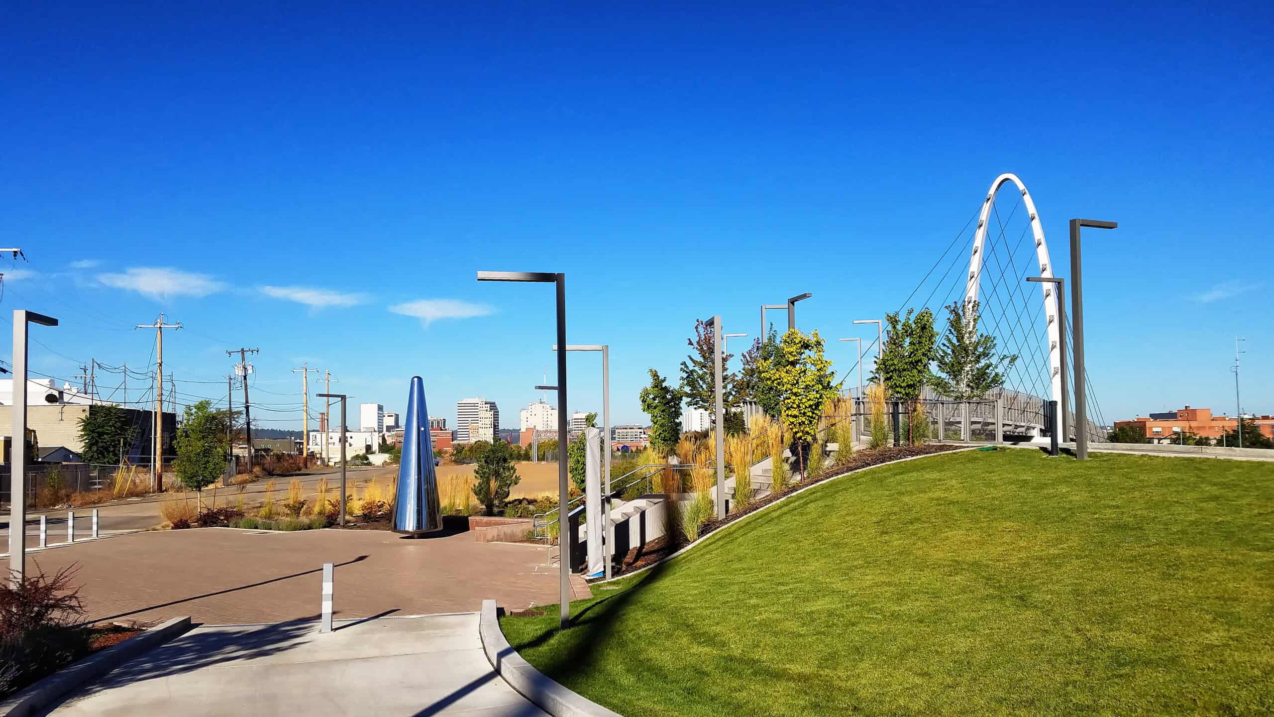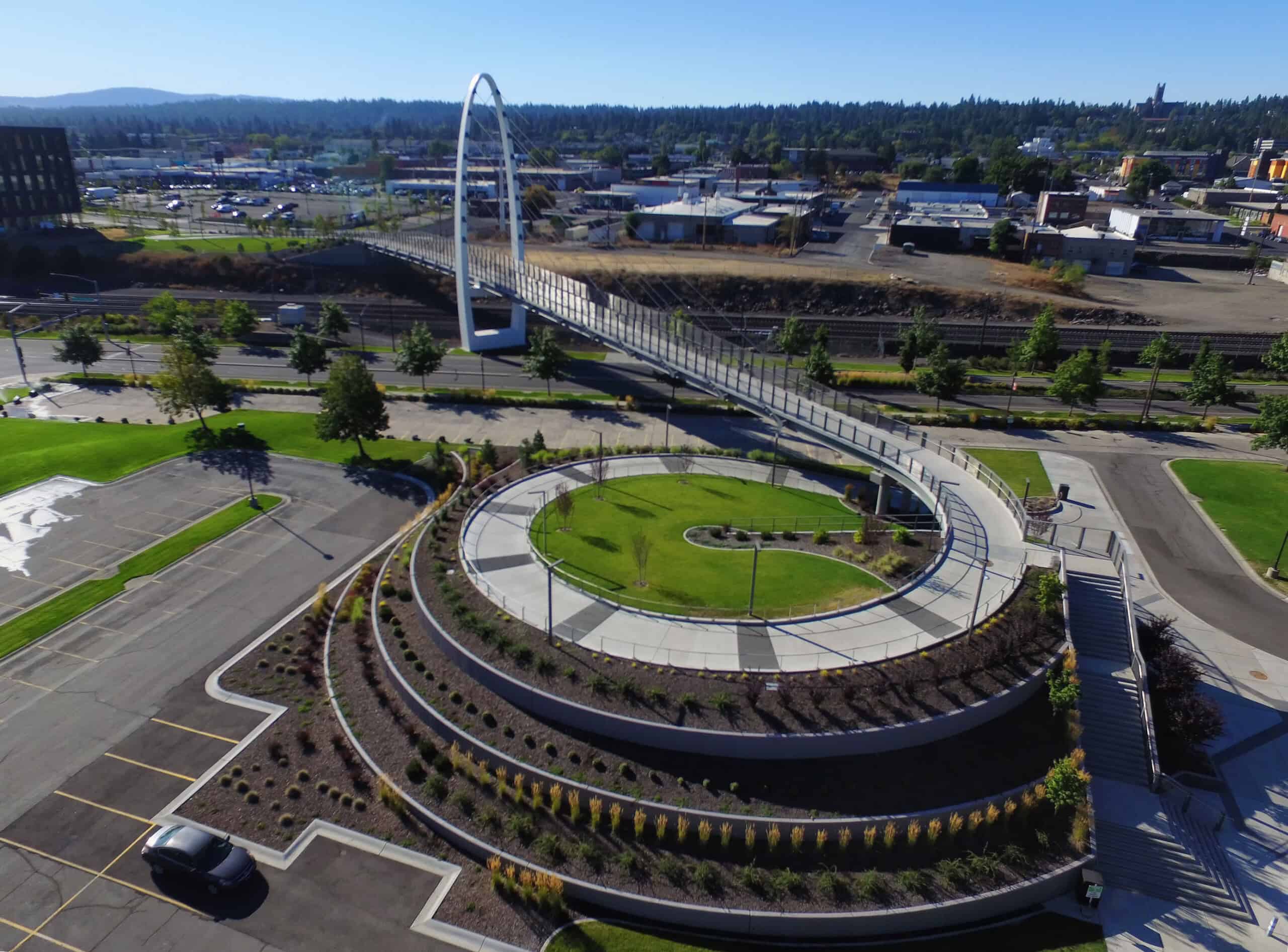 University District Gateway Bridge: The University District Gateway Bridge links Spokane’s south university district with the campuses of WSU, Whitworth University, Eastern Washington University, and Gonzaga University. Working closely with campus staff, city engineers, the University District Board, and the general public, the SPVV design team was responsible for integrating both bridge landings into the surrounding landscape. The design integration includes alternative modes of transportation, public art, and bicycle circulation routes. Key elements are the circulation and serpentine egress on both landings, grand stair cases at both landings that allow the ascent and descent of the pedestrian user to access the bridge crossing, safe and well-lighted routes of travel, and travel ways that are easy to maintain.