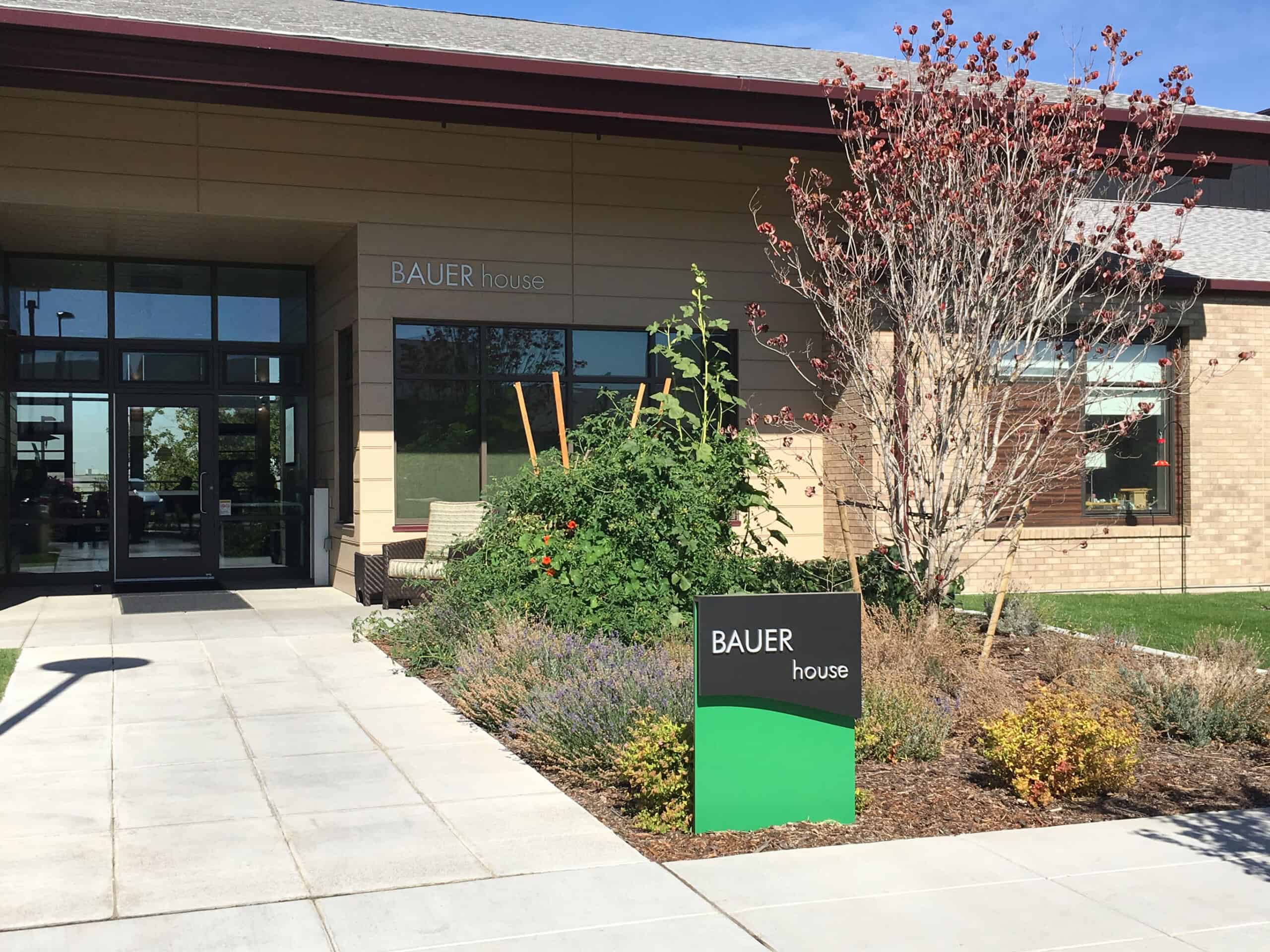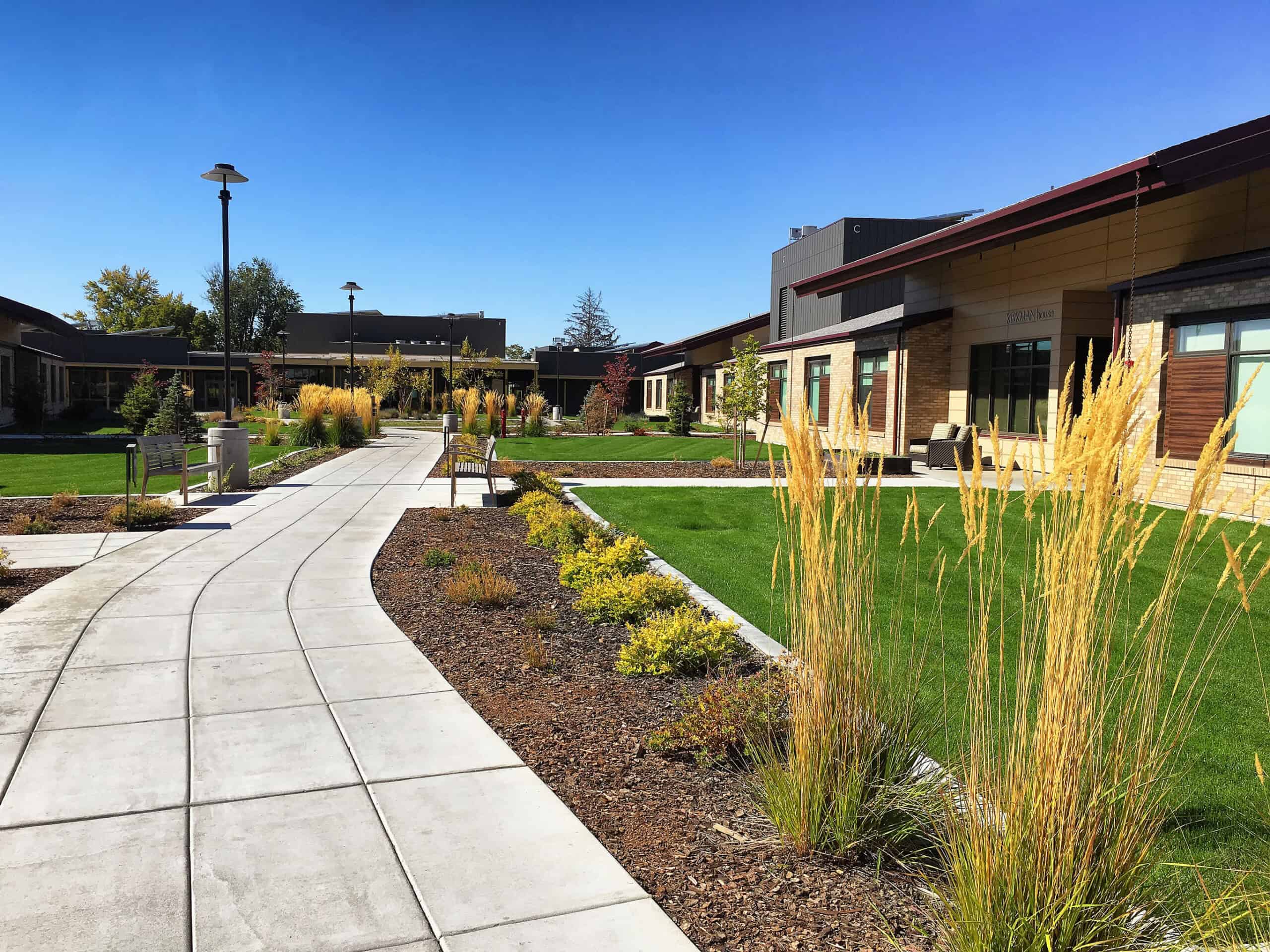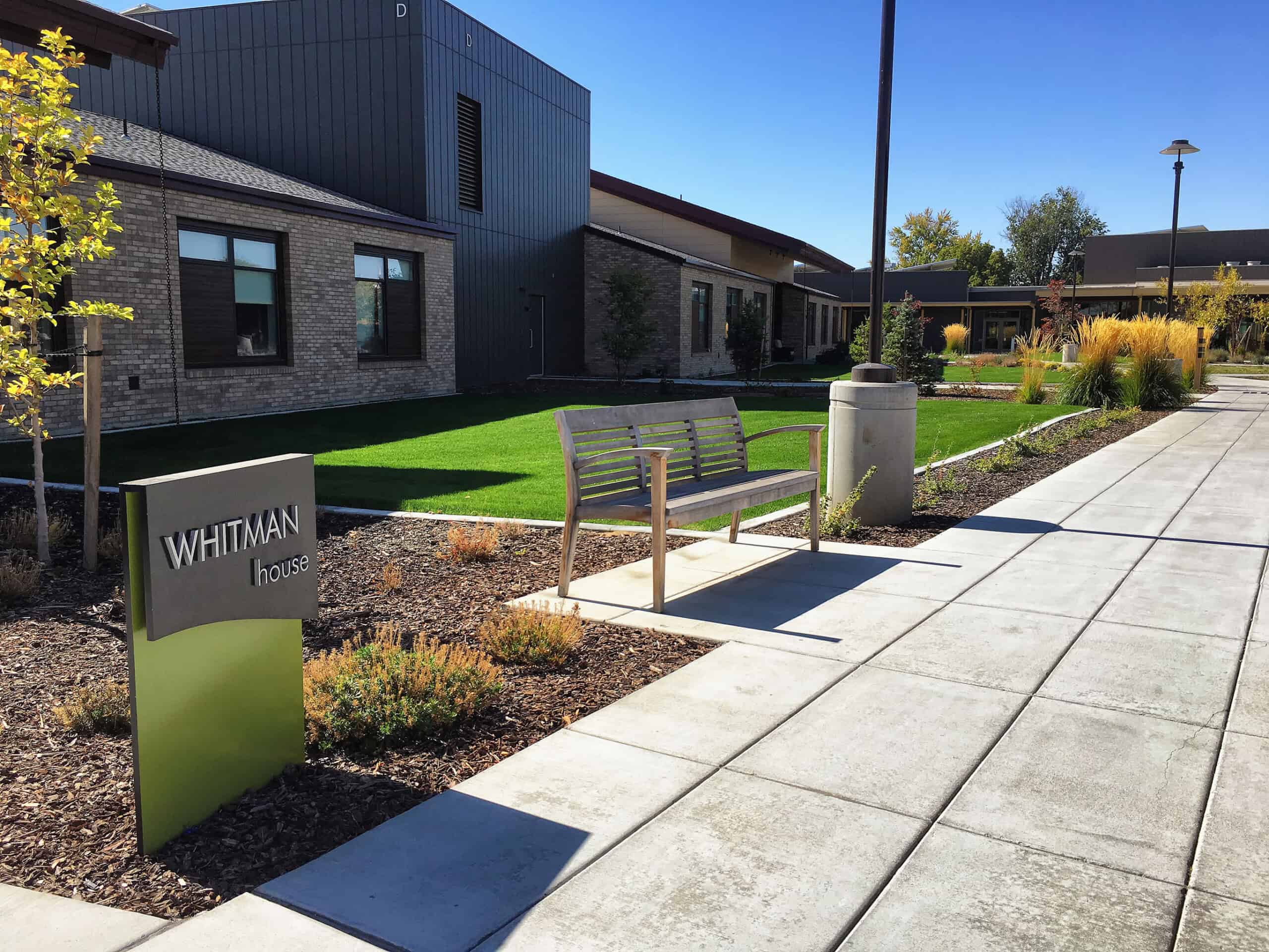 This project includes four individual neighborhoods with eight resident “homes,” a central Community Center, and facilities building on ten acres. To encourage wayfinding and identity, each resident home has its own name, theme, color scheme, patio, and wheelchair-accessible raised bed gardens. The raised bed gardens allow residents to personalize, plant, and tend their own herbs, vegetables, or annuals.